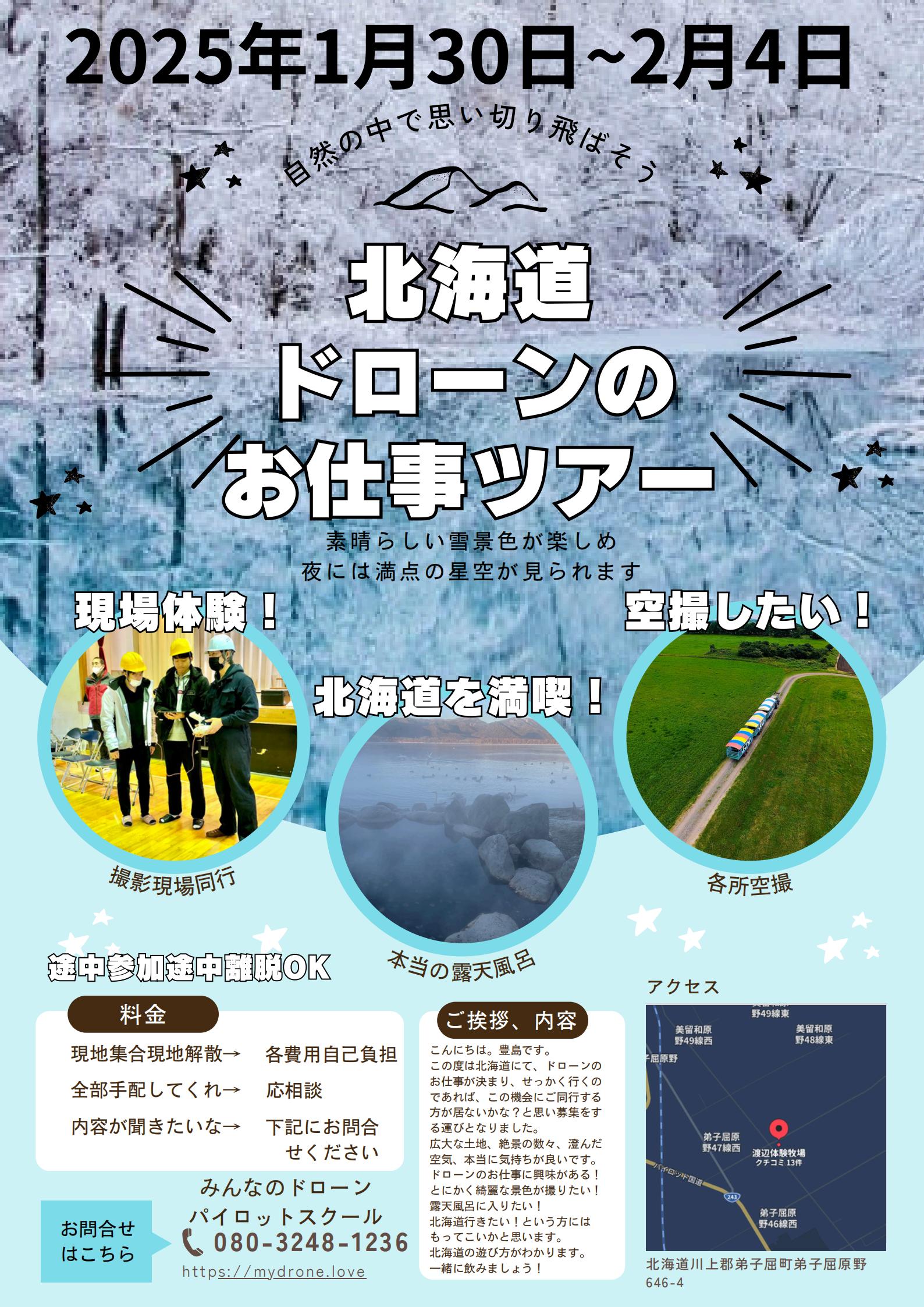 北海道ドローンのお仕事ツアー 2025年1月31日~2月4日 2025.02.06ドローンツアー HOME ブログ ドローンツアー 北海道ドローンのお仕事ツアー 2025年1月31日~2月4日 Tweet Share RSS お申し込みフォーム 氏名 申し込み日 参加人数 ※プルダウンでお選びください 1名2名3名4名5名6名7名8名~ メールアドレス 電話番号 メッセージ本文 (任意) Δ 投稿者: oresamasuzuki ドローンツアー コメント: 0 ドローン体験in渡辺体験牧場 2024年9月28.29日 コメント ( 0 ) トラックバック ( 0 ) この記事へのコメントはありません。 この記事へのトラックバックはありません。 トラックバック URL 返信をキャンセルする。 名前 ( 必須 ) E-MAIL ( 必須 ) ※ 公開されません URL 上に表示された文字を入力してください。Δ 関連記事一覧 関連記事はありません。